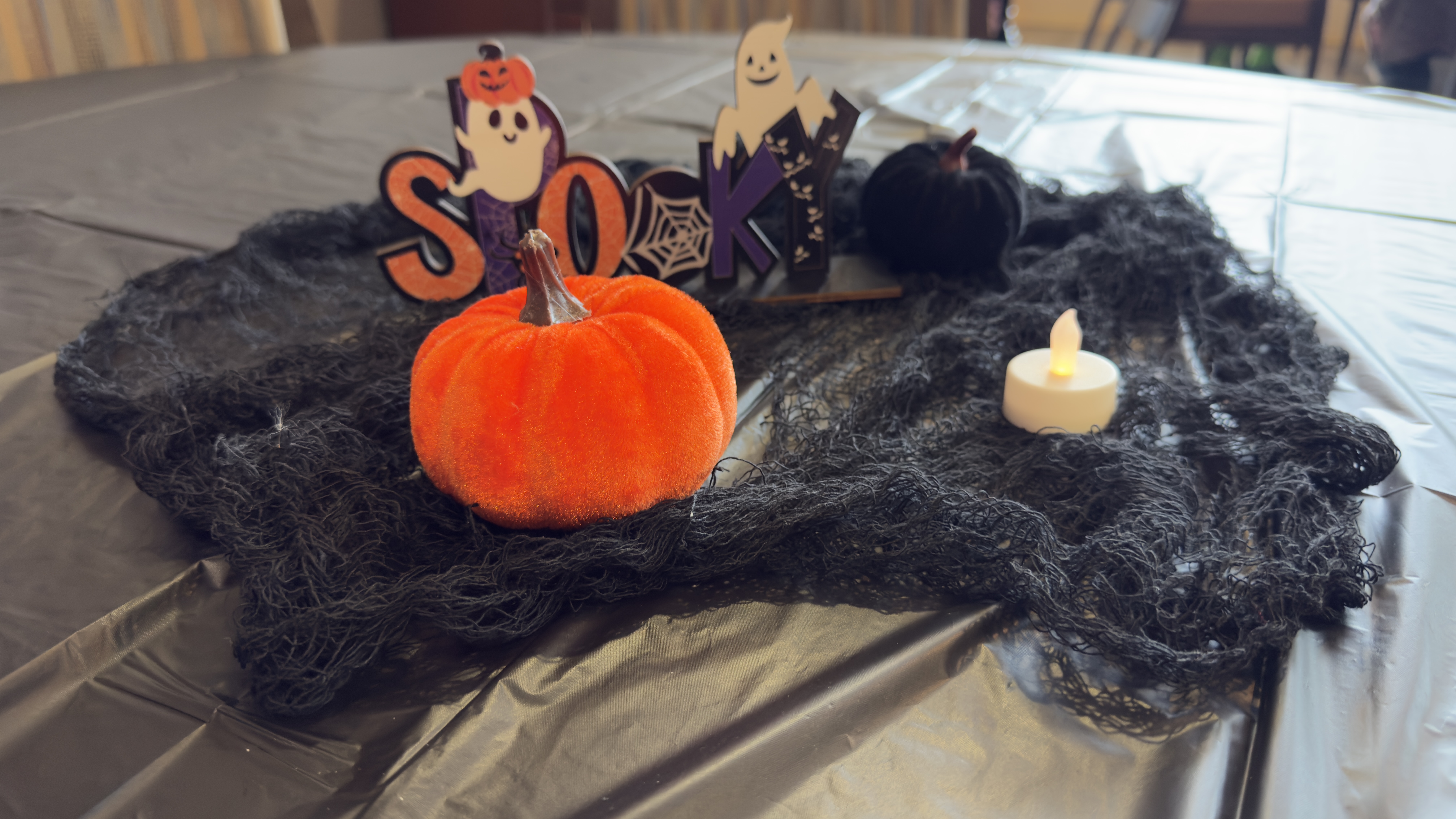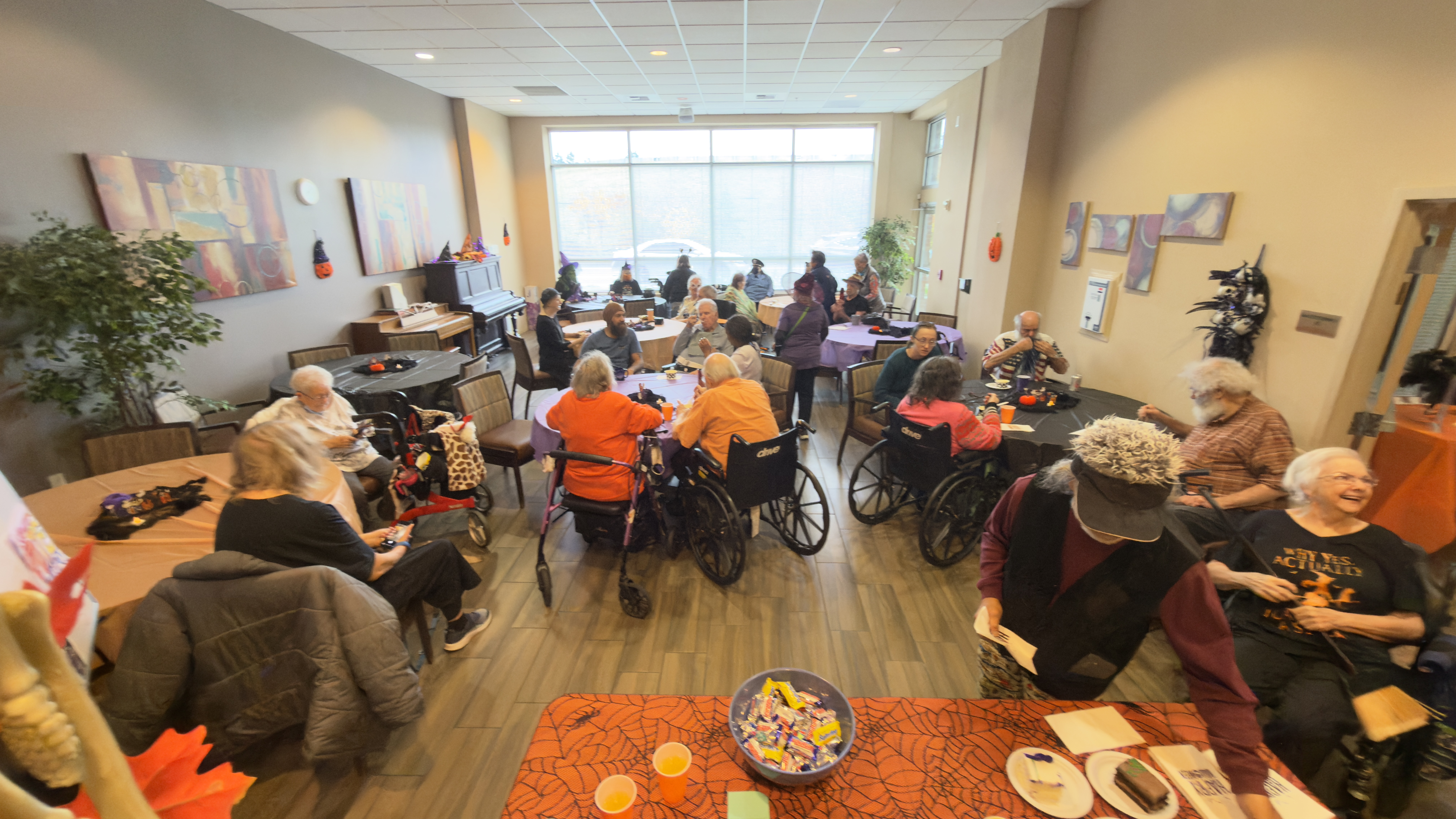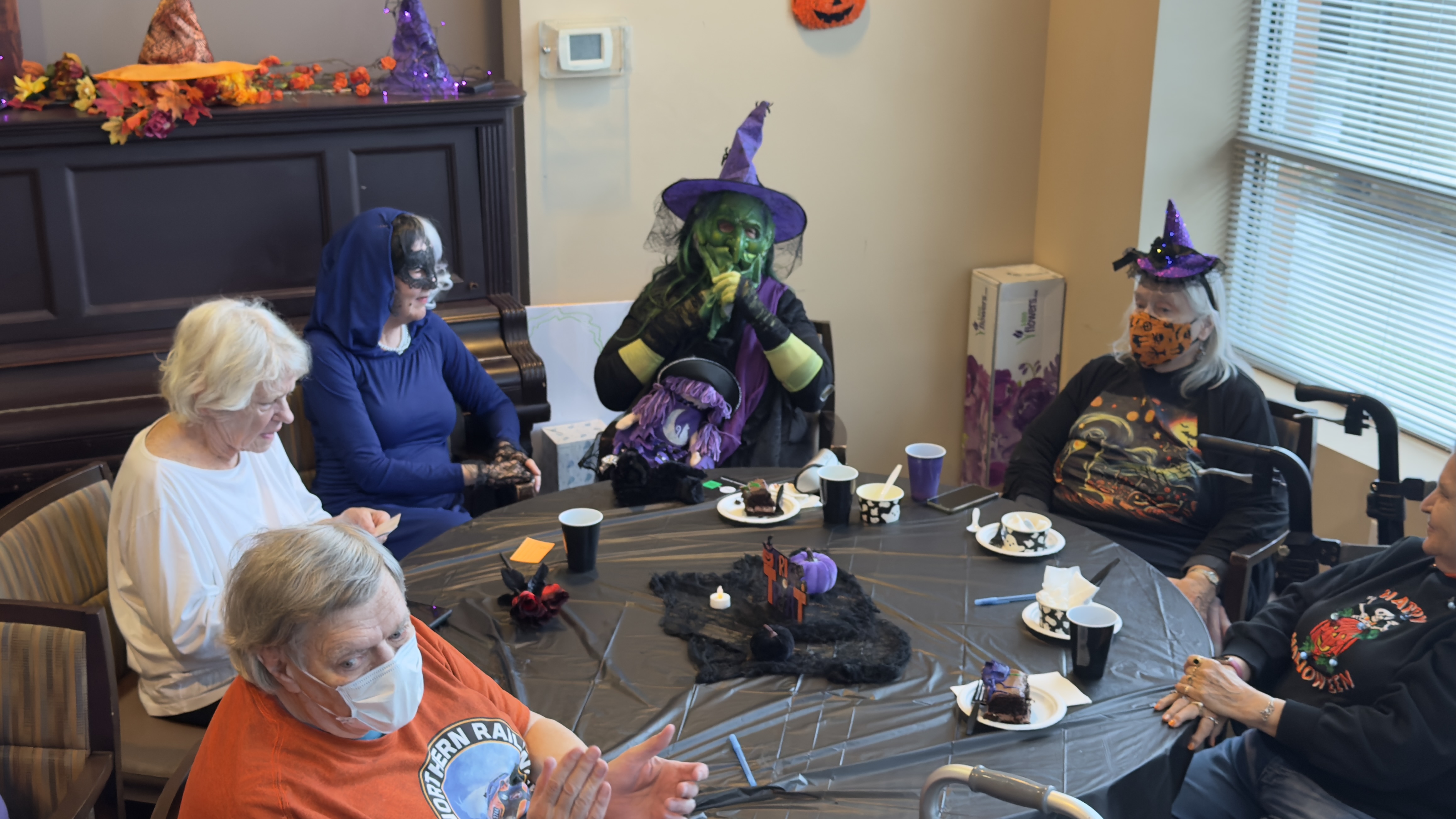 Residents gathered for a festive Halloween celebration filled with costumes, laughter and sweet treats in their community room. Tables were draped in orange, purple and black, and centerpieces featured pumpkins, spiderwebs and flickering candles. Guests enjoyed cake, cookies and punch as they chatted and admired one another’s costumes under garlands of autumn leaves and tiny skeletons.