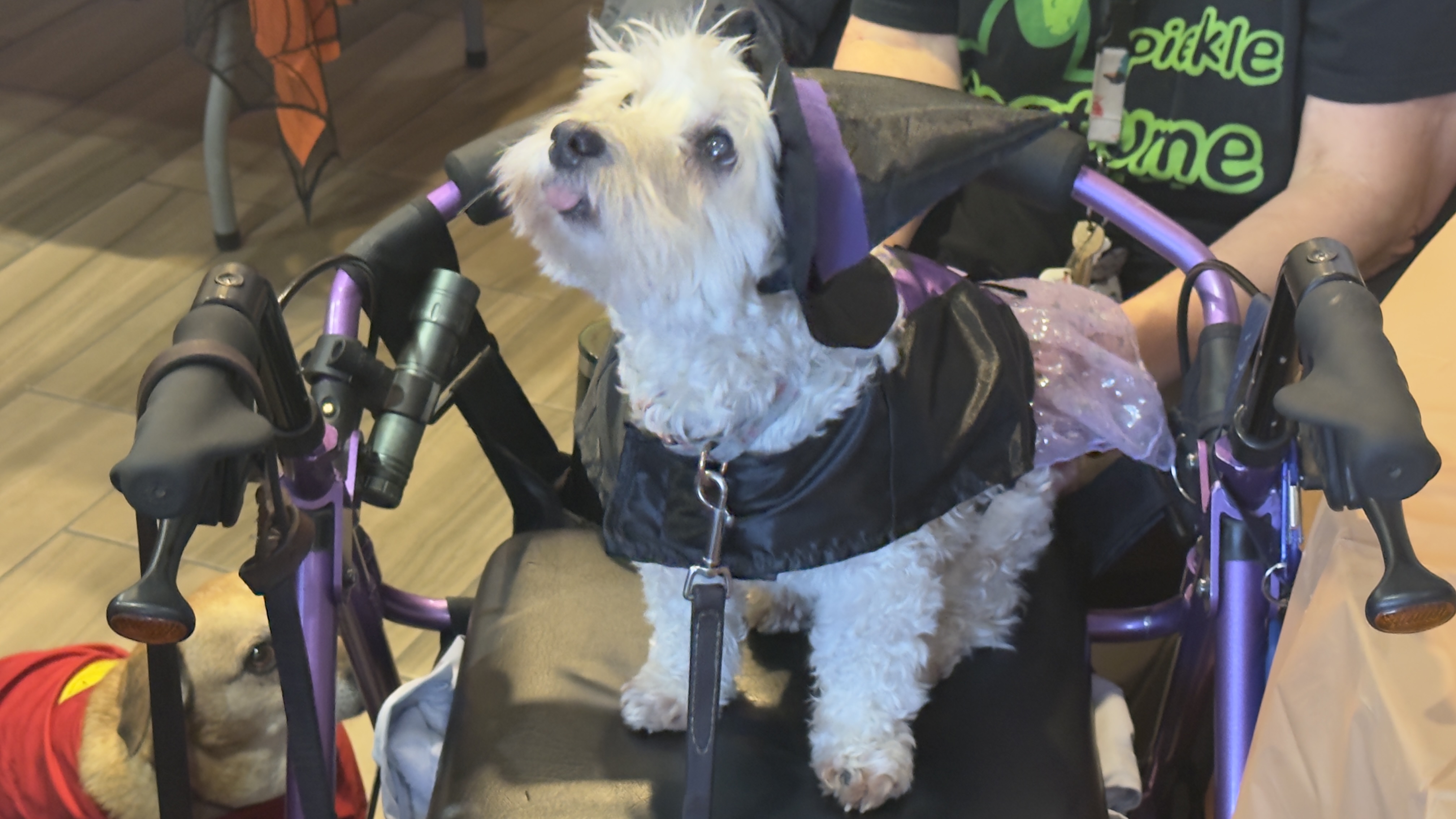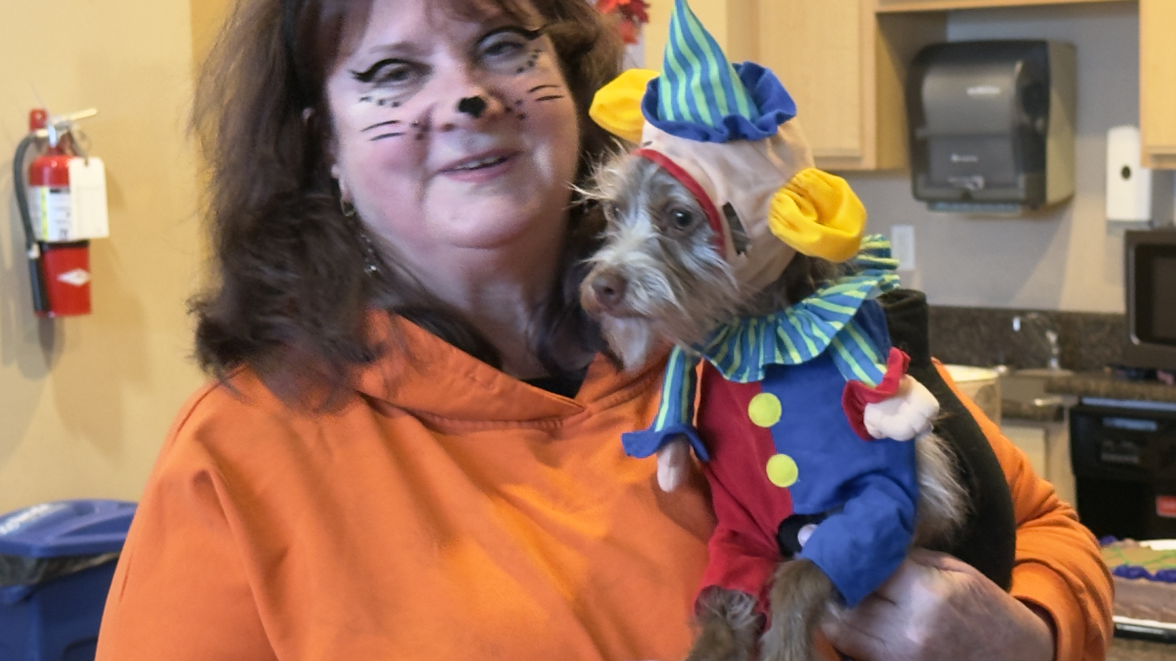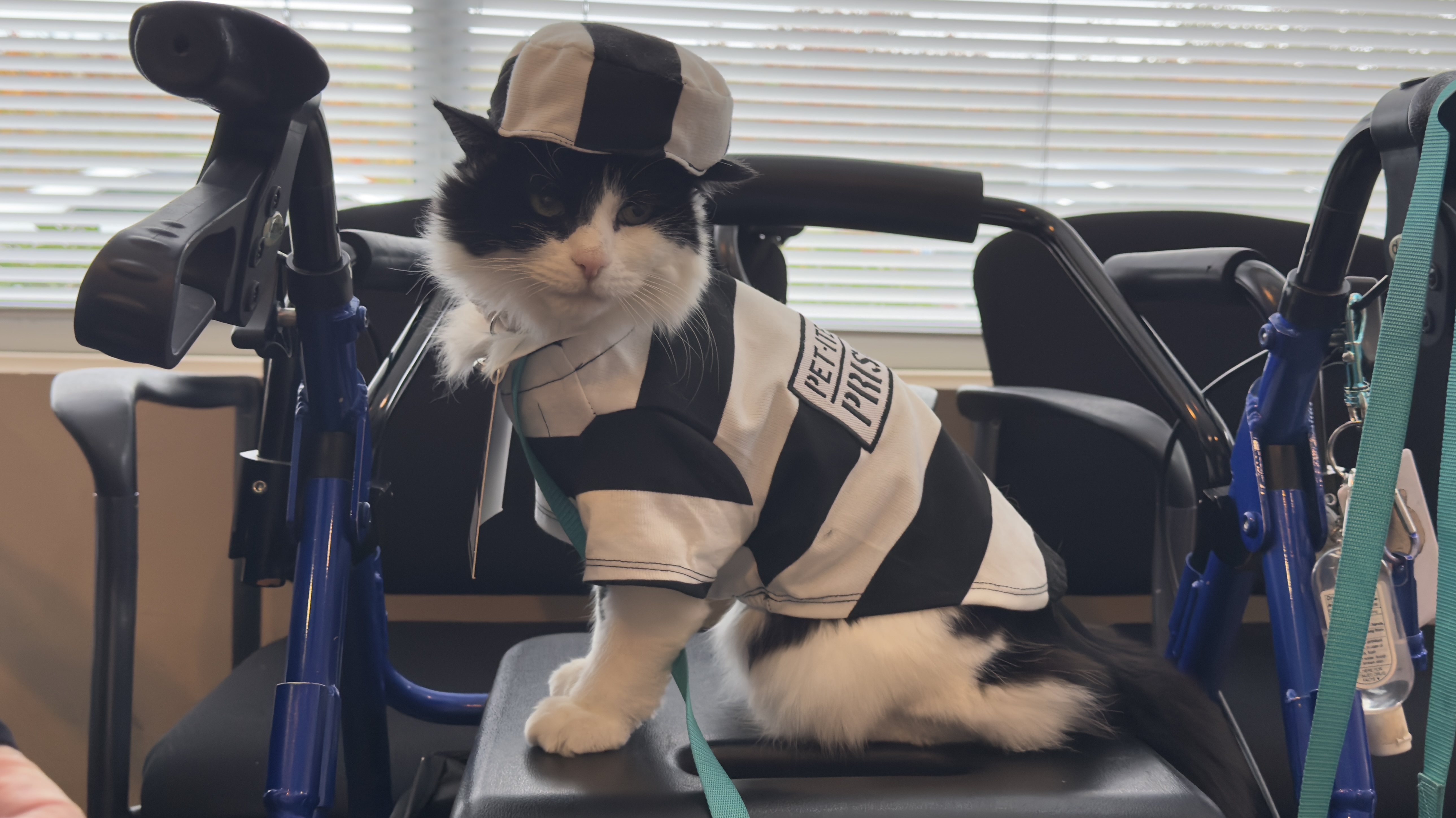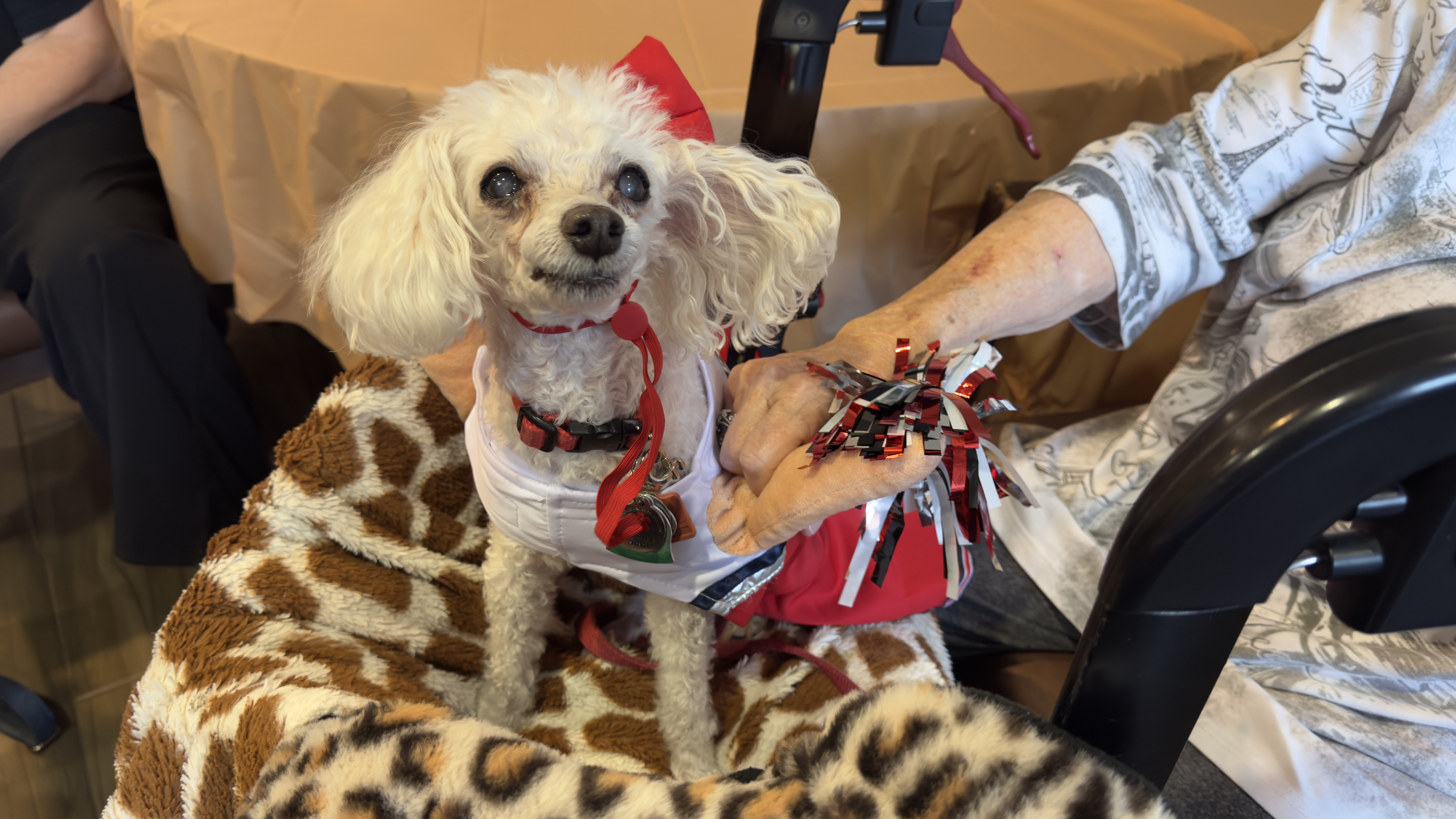 The highlight of the afternoon was the costume contest, which drew spirited participation from both residents and their pets. Piper the cat, dressed as a “pet prison” inmate, took first place, followed by Sabrina the cheerleader poodle in second and Rosy the witch dog in third. The pets sat patiently on walkers and laps, soaking up attention as residents cheered for their favorites.